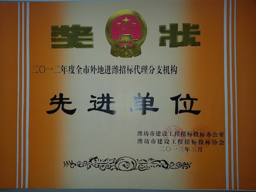 最近,在濰坊市建設(shè)工程招標投標協(xié)會組織的2012年度先進單位和個人評選活動中,我公司濰坊分公司榮獲“2012年度全市外地進濰招標代理分支機構(gòu)先進單位”稱號,高偉九同志被評為“2012年度全市招標代理工作先進個人”。這是濰坊市建設(shè)工程招標投標辦公室與建設(shè)工程招標投標協(xié)會根據(jù)2012年度招標代理機構(gòu)定期考核結(jié)果和實際工作情況評選的,全市共評出8家單位為外地進濰招標先進分支機構(gòu)。
